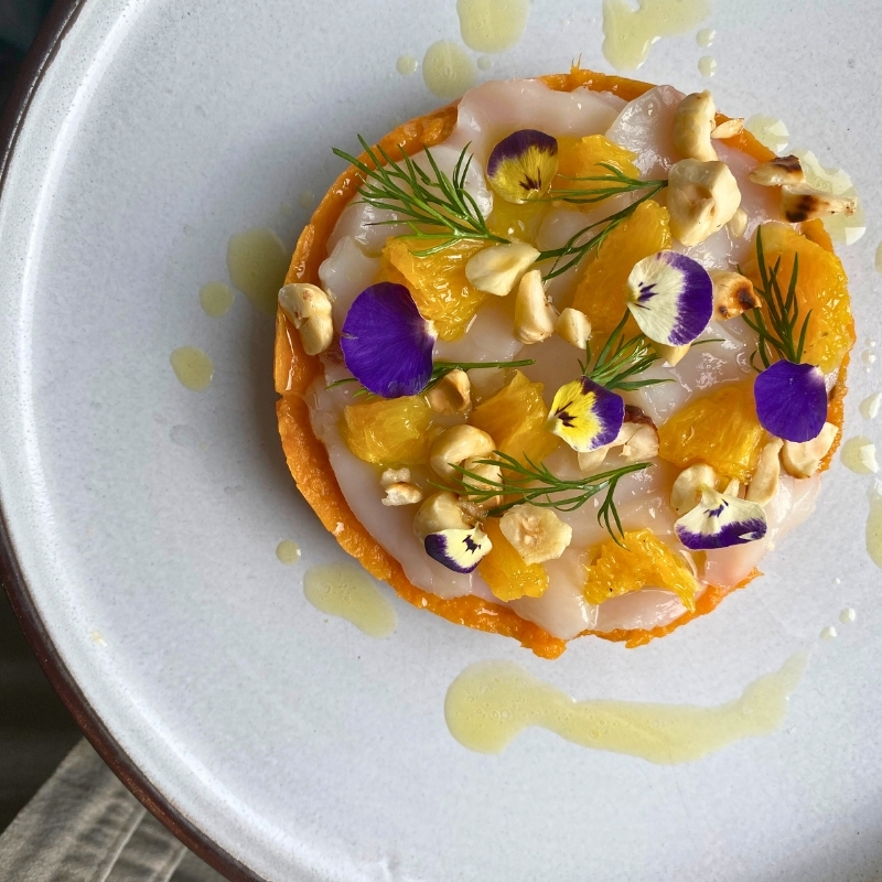 - Grilled sea bass with an almond crust, carrot purée, and orange sauce