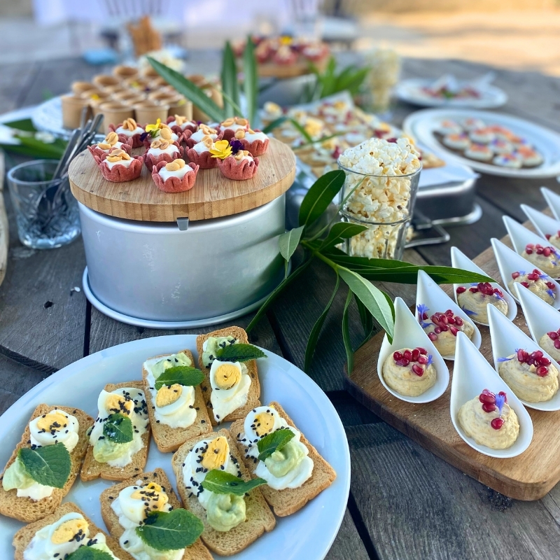 Fresh gazpacho and mint leaf crackers, goat cheese, fig mini tartlet, houmous, lemon quail egg, honey and black sesame crackers, ricotta, smoked ham