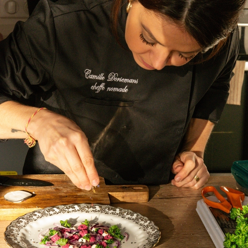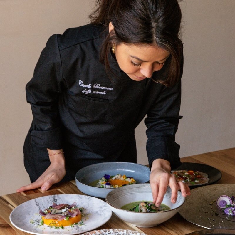 After an initial career in design, Camille returned to her first passions—cooking and cheesemaking. After a long journey working on farms and in restaurants around the world, she returned to France and opened her own restaurant. After the pandemic, she chose to focus on private dining, allowing her to connect more closely with her clients and offer them a truly unique culinary experience.