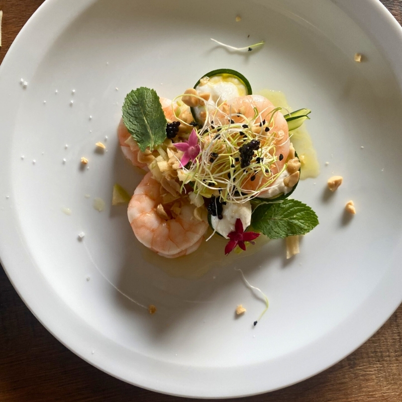 - Goat cheese, zucchini tagliatelle, fresh shrimps, green apple and lemon zest, lumpfish roe, peanuts