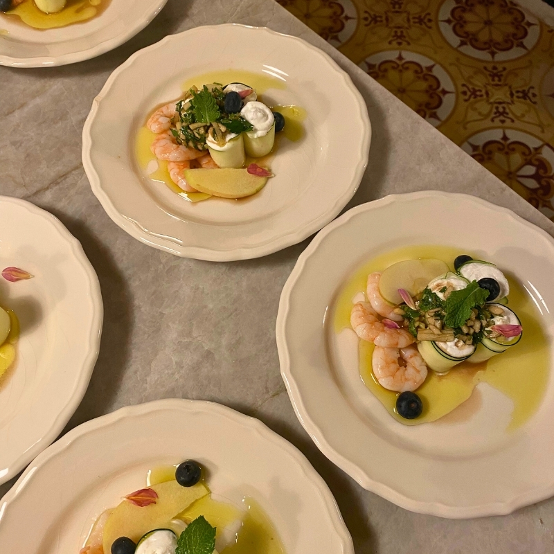 - Zucchini tagliatelle, fresh shrimps, green apple, mint, and honey vinaigrette, peanut chips