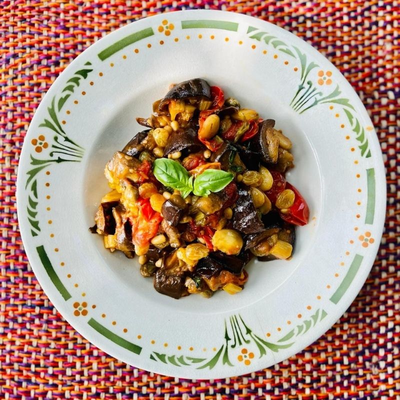 - Roasted eggplants and cherry tomatoes, buffalo mozzarella and coriander–anchovy salsa